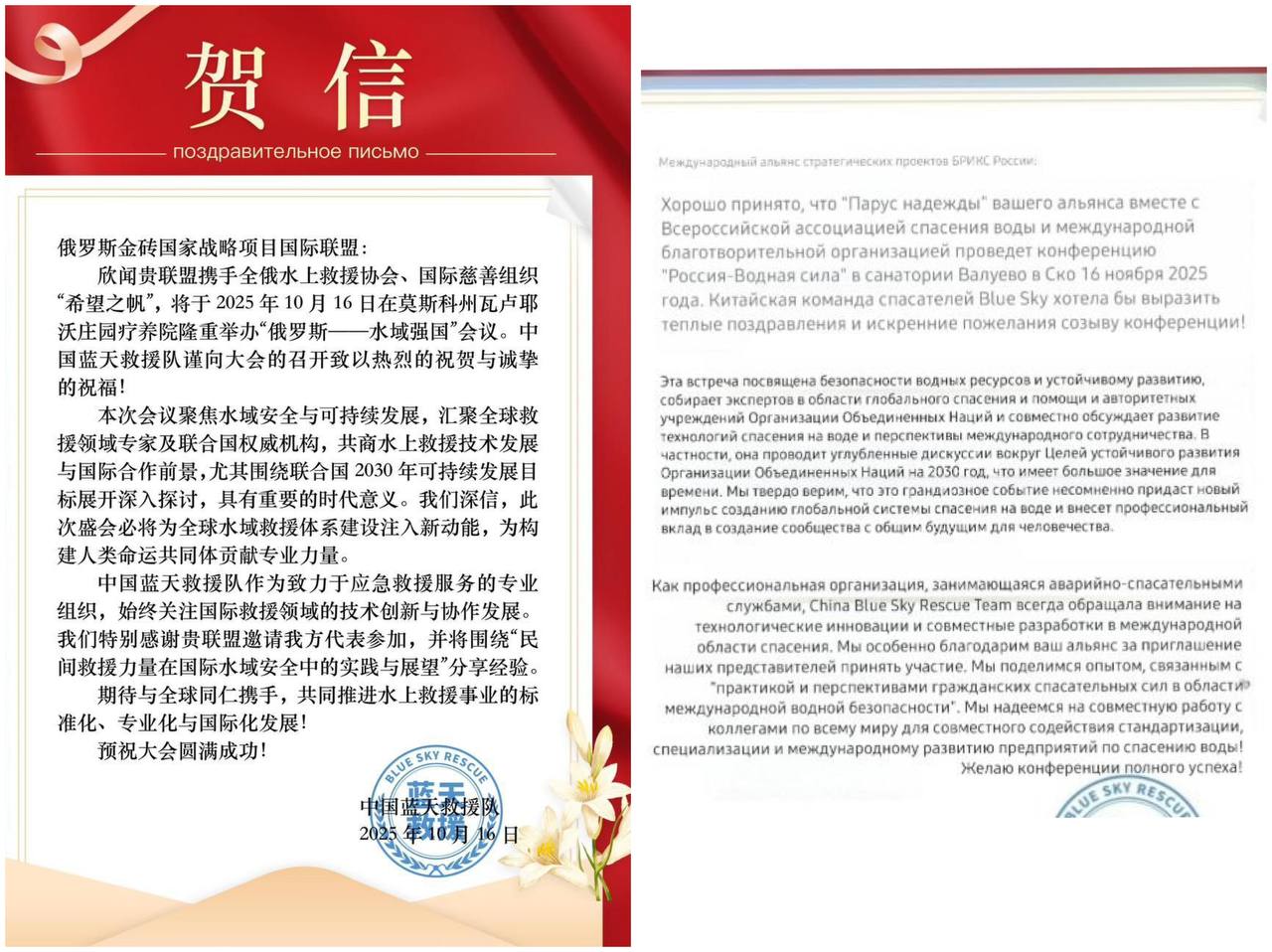 Поздравительное письмо от китайской спасительной команды "Голубое небо" для Международного Альянса стратегических проектов БРИКС по случаю сегодняшнего мероприятия 🤝